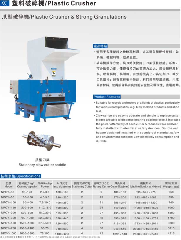 適用于各種逆料之粉碎再利用,尤其對各類硬性塑料(如料頭,鞋楦料等)效果更佳。NPCY系列破碎機操作方便,換刀簡便快捷;刀架優(yōu)化設(shè)計,爪型刀可分散受力度,便得每片刀和剪切力加大,適合破碎厚材料,硬質(zhì)料塊,料頭等,有效的提高了刀具切削力,減少刀具磨損;設(shè)有電控按全設(shè)計,料頭采用雙層結(jié)構(gòu),內(nèi)填隔音材料,使得設(shè)備具有良好的安全性及環(huán)保性,省電耐用。